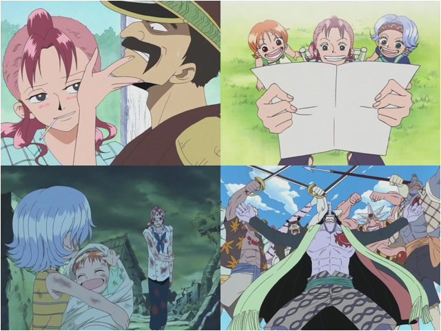 1336k E32 - La bruja de la aldea Cocoyashi. Tras ella aparece tambaleante Nico Robin. La serie comienza con la ejecución de Gol D.